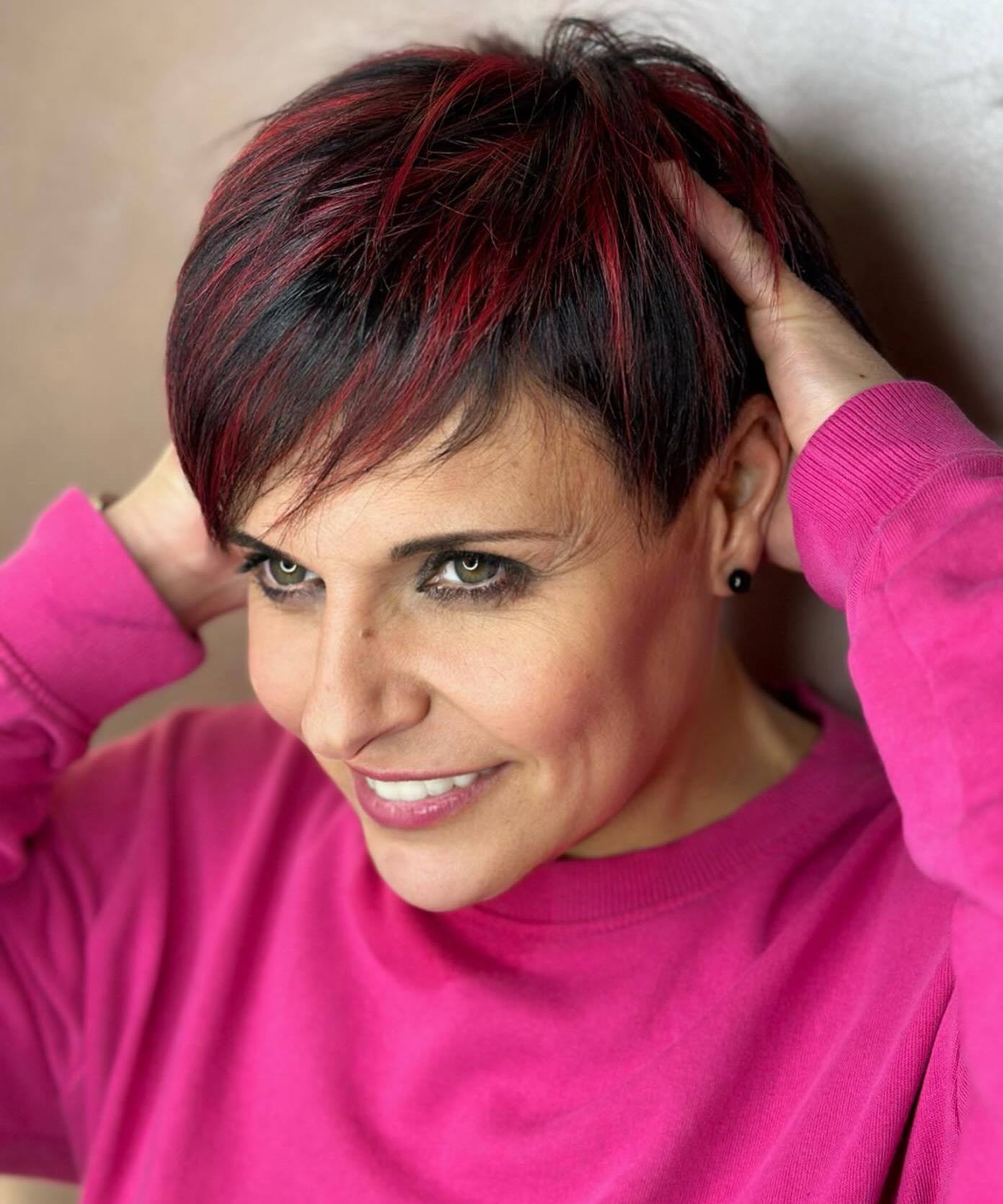 This cut is great for women who want a little more ease with their hair. A classic pixie cut is very customizable and works with any hair texture and thickness. To create an illusion of thickness for a darker color and more texture, add blonde highlights.