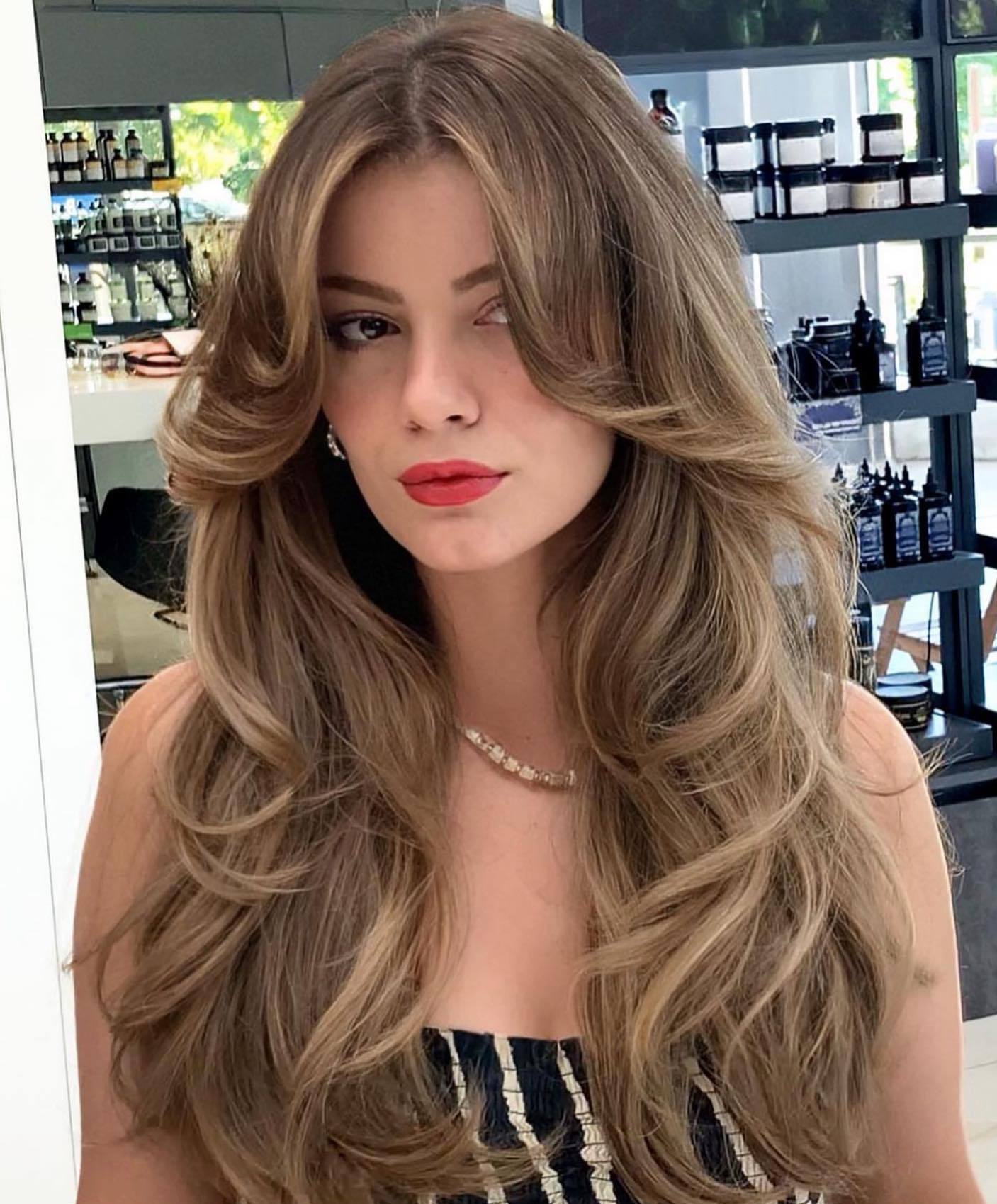 Imagine the look of extra-long hair with light feathered layers in a free-flowing hairstyle! If you have lush tresses that are long enough to recreate a similar style, we suggest you enhance them with a creamy vanilla balayage that also brightens your complexion.