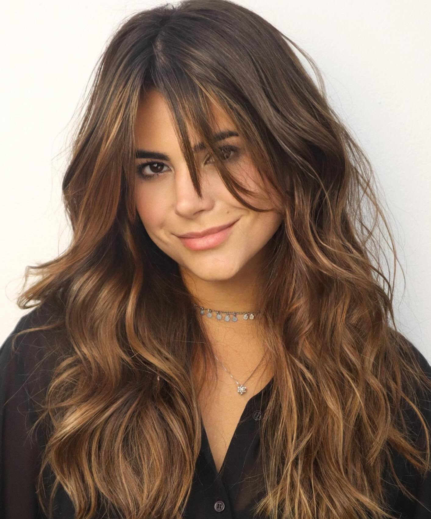 A seamless multilayered haircut like this never goes out of style. Make your brown hair layered and wavy throughout the length, and highlight it with blonde and caramel hues to create more movement and a fuller feel!