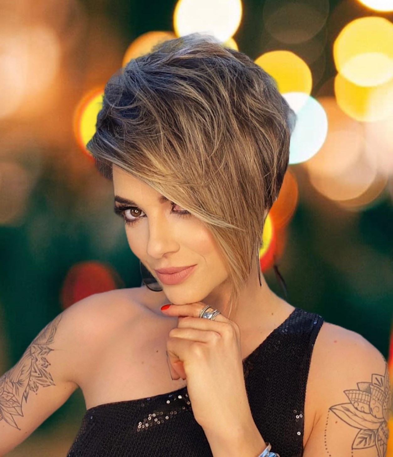 Do you want a fast and easy-care hairstyle that will take just a few minutes to put together in the morning? You’ll adore a simple, straightforward pixie with side-swept bangs and lots of feathered layers at the top. The tapered nape area and long side pieces make fine hair appear thick and healthy, and the metallic blonde highlights blend in perfectly with the darker roots.