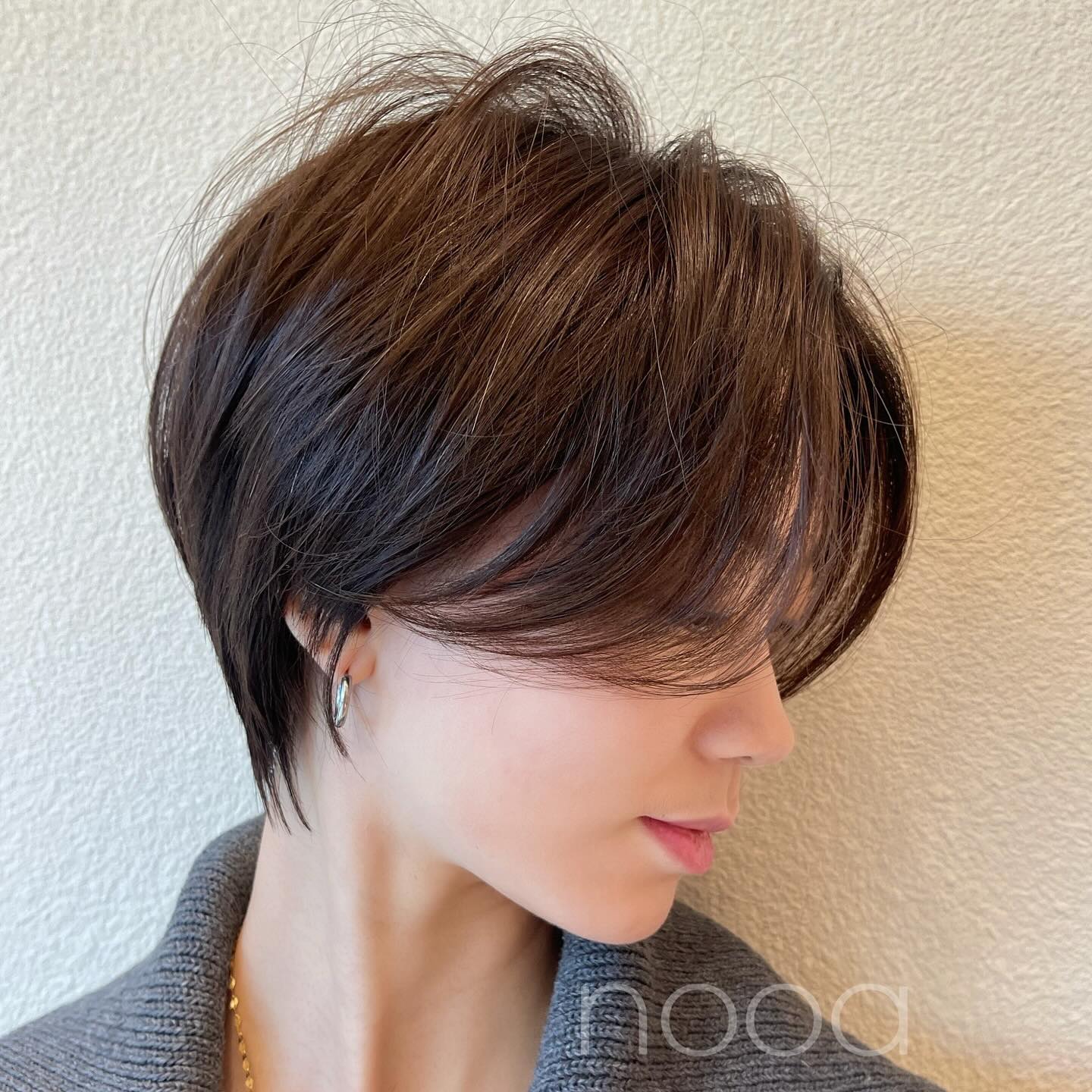 How to look your best while growing out a short pixie? Start shaping it into a mini disconnected bob. Tucking a few strands behind one ear and sweeping the bangs to the side will disguise the awkward period of your hair growing out. Bright blonde highlights over medium brown hair add youthful cheeriness to the simple cut.