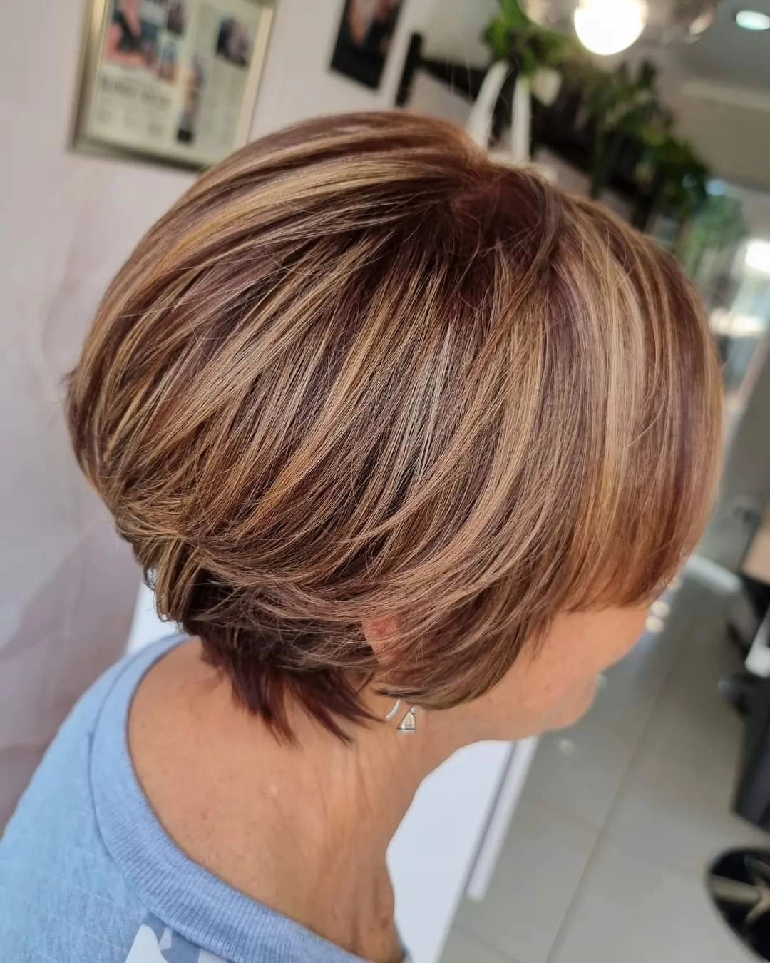 Opt for a shorter bob that has a nice lift at the back thanks to stacked layers. Add highlights at the top of your hair to give your style a pop of color and vibrancy.