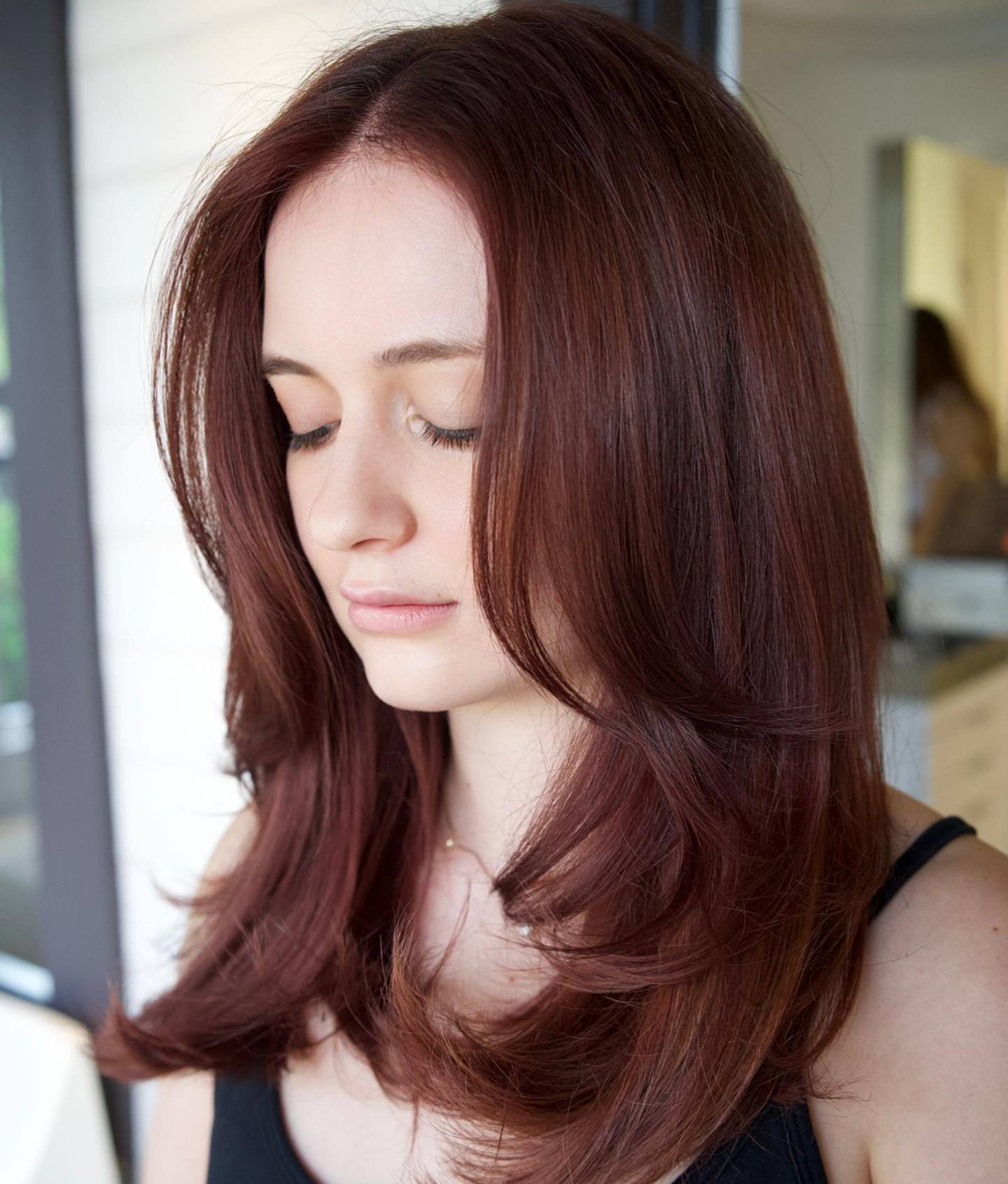 If you have fair skin, bright blue or green eyes, and you’ve got your heart set on an auburn color, we recommend going with a vibrant shade. Long hair can be tricky when it comes to shades of red because it can outshine everything else in your appearance. To make your new color more sophisticated, ask your hairstylist to add some lowlights.