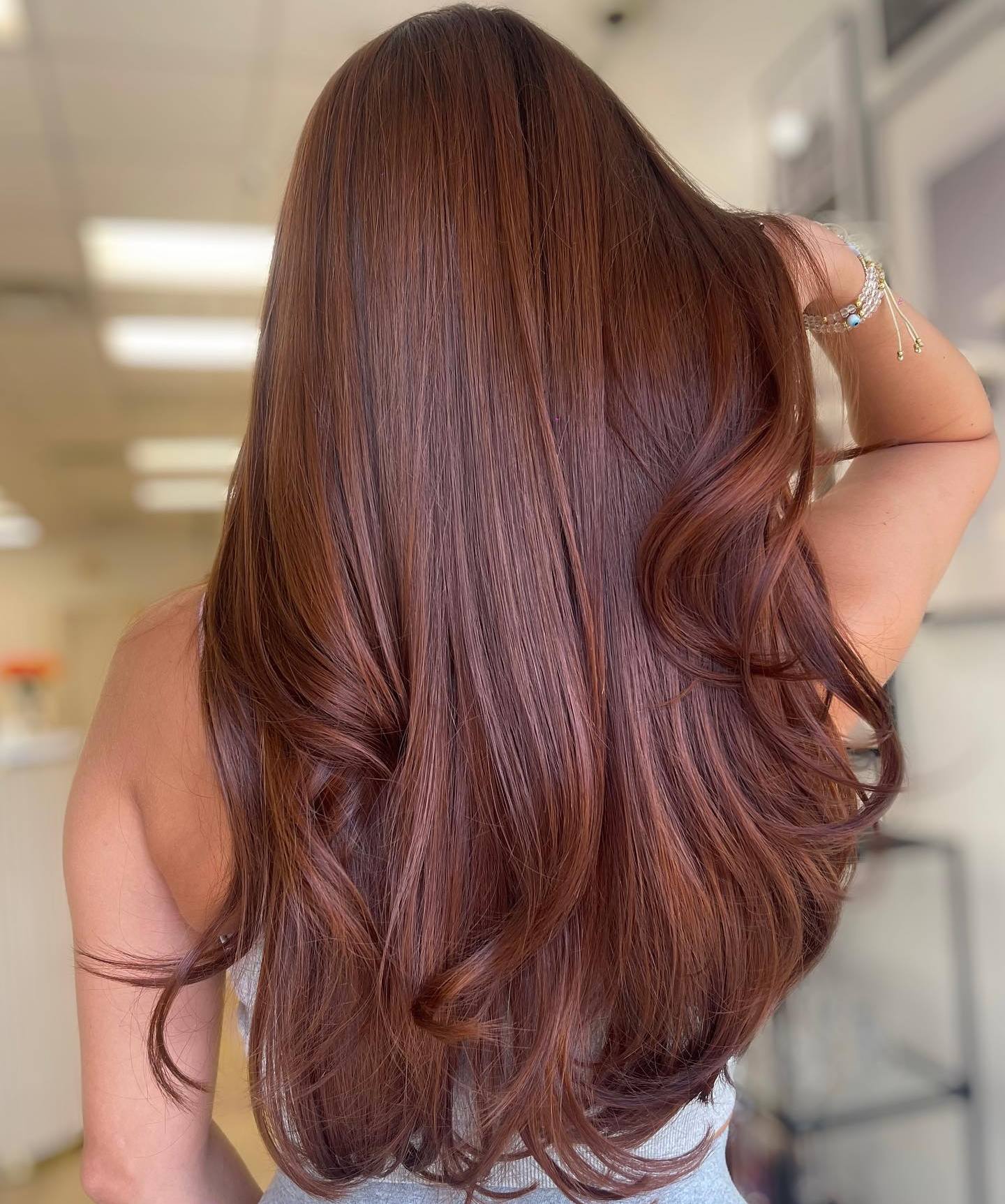 If you’re uncertain about what shade to use, play around with a color chart, considering different shades of brown hair, as well as reds and some tones in between. Consult a hair colorist who’ll work their magic to choose the perfect shade for your complexion and eye color. These cherry, chocolate, and copper hues look amazing for long locks.