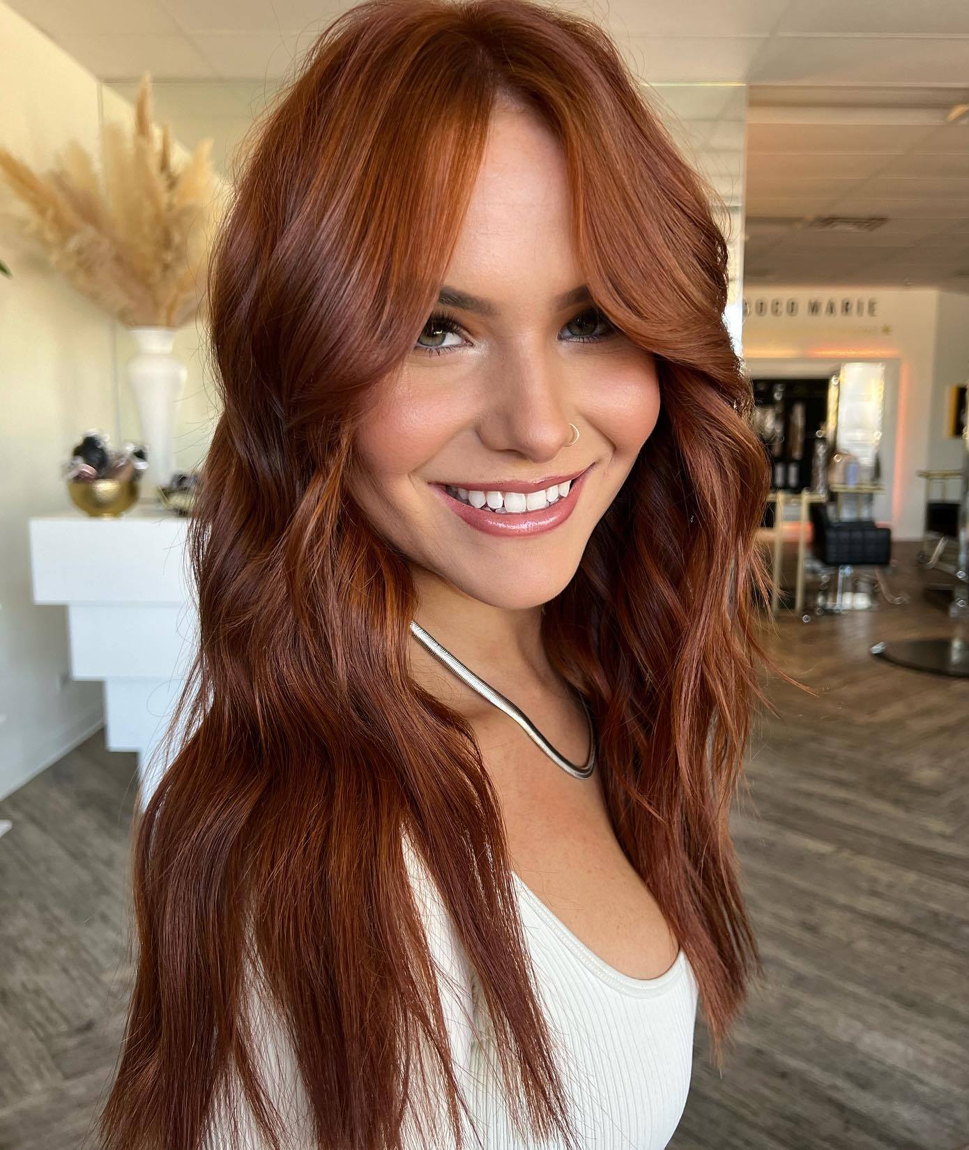Fall in love with this mind-blowing copper red hairstyle that oozes classy, Old-Hollywood vibes. Style smooth waves that flow like silk to show off the depth and shine of your new hair color.